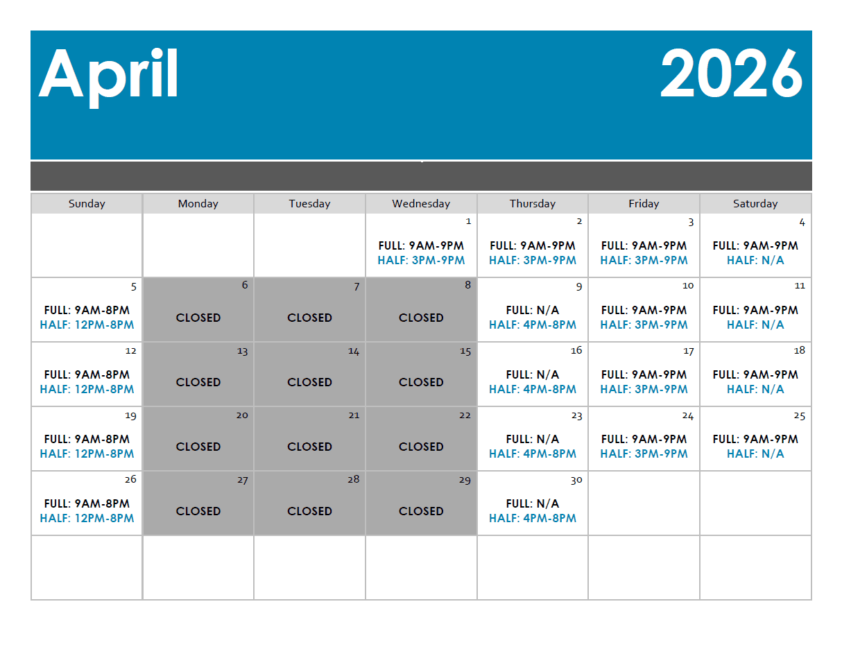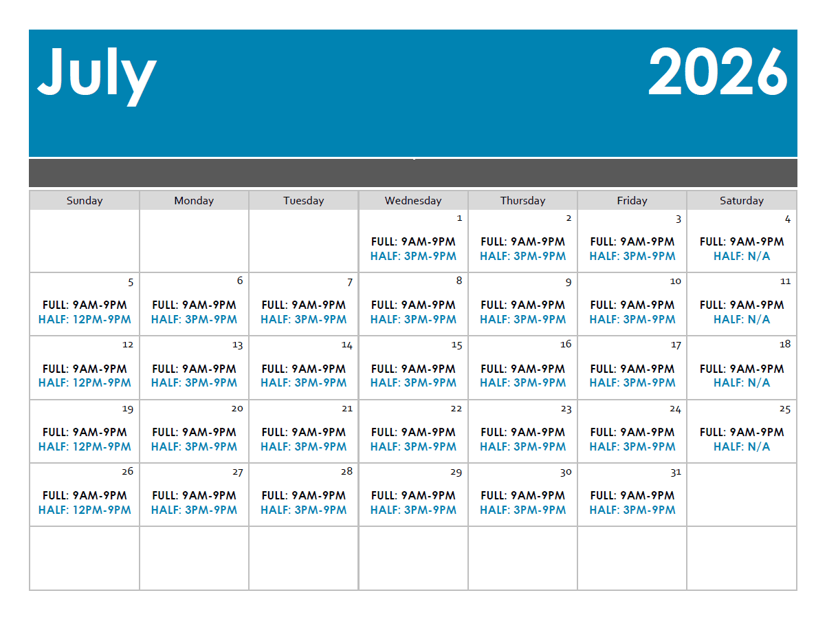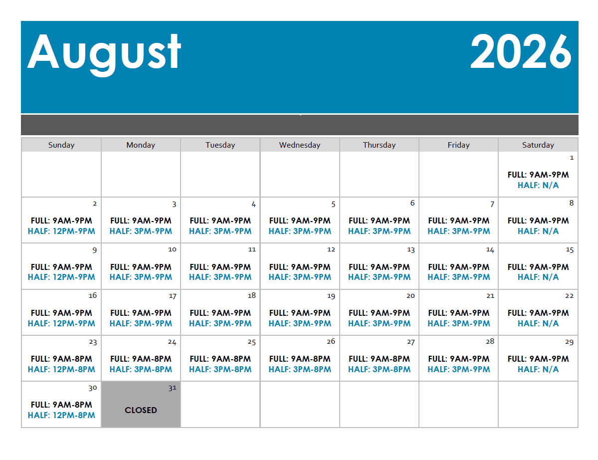 *PLEASE NOTE: Pricing and availability of waterpark day passes are subject to change at any time. We do not guarantee that we will sell day passes to the general public due to waterpark capacity. Half day passes may be unavailable during peak times including Spring Break, Winter Break, special event dates, and select holidays. Half day and full day hours listed below are based upon our typical schedule, and are subject to change. Please visit the “Hours” tab above for a full calendar listing of park hours. We encourage calling on the morning of your visit to inquire about availability and pricing.*