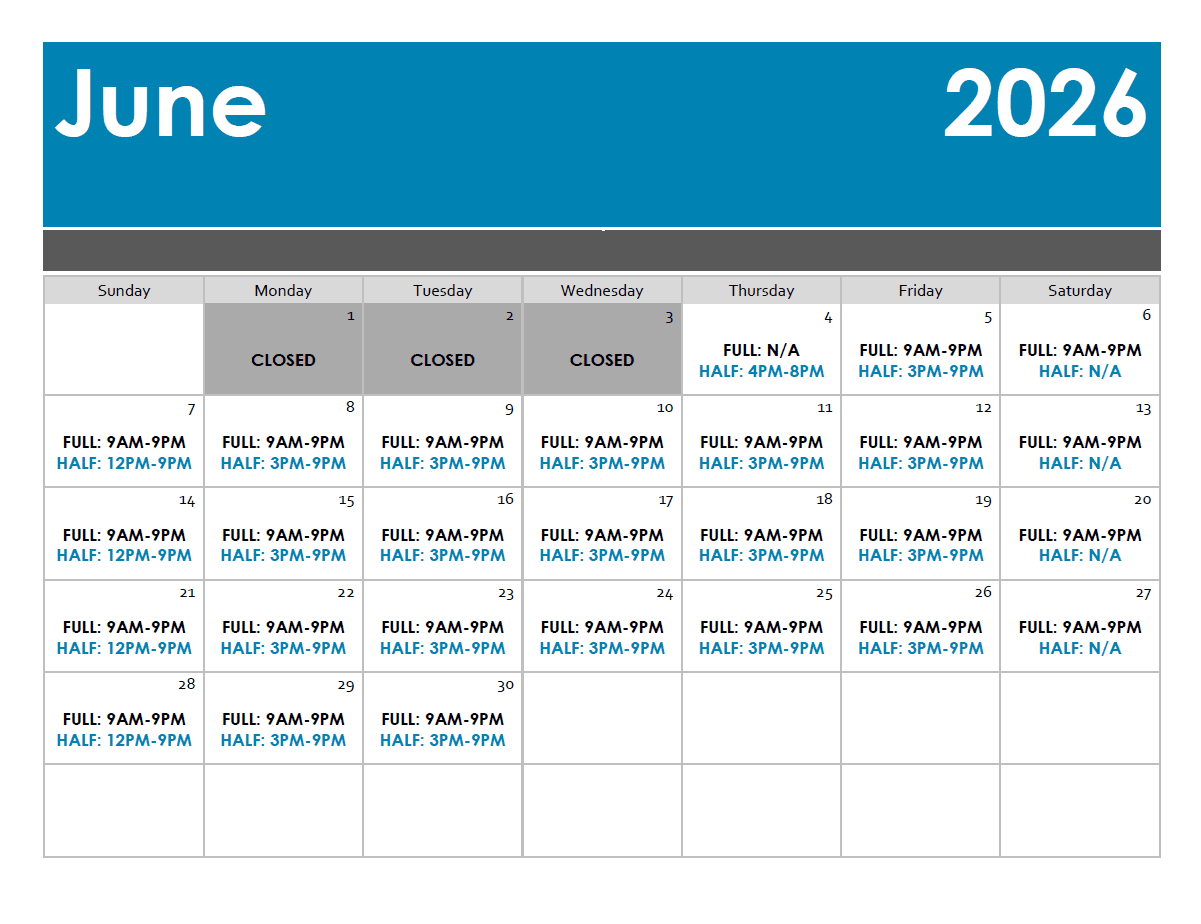 **Arcade has same operating hours as the waterpark. Hours are subject to change.